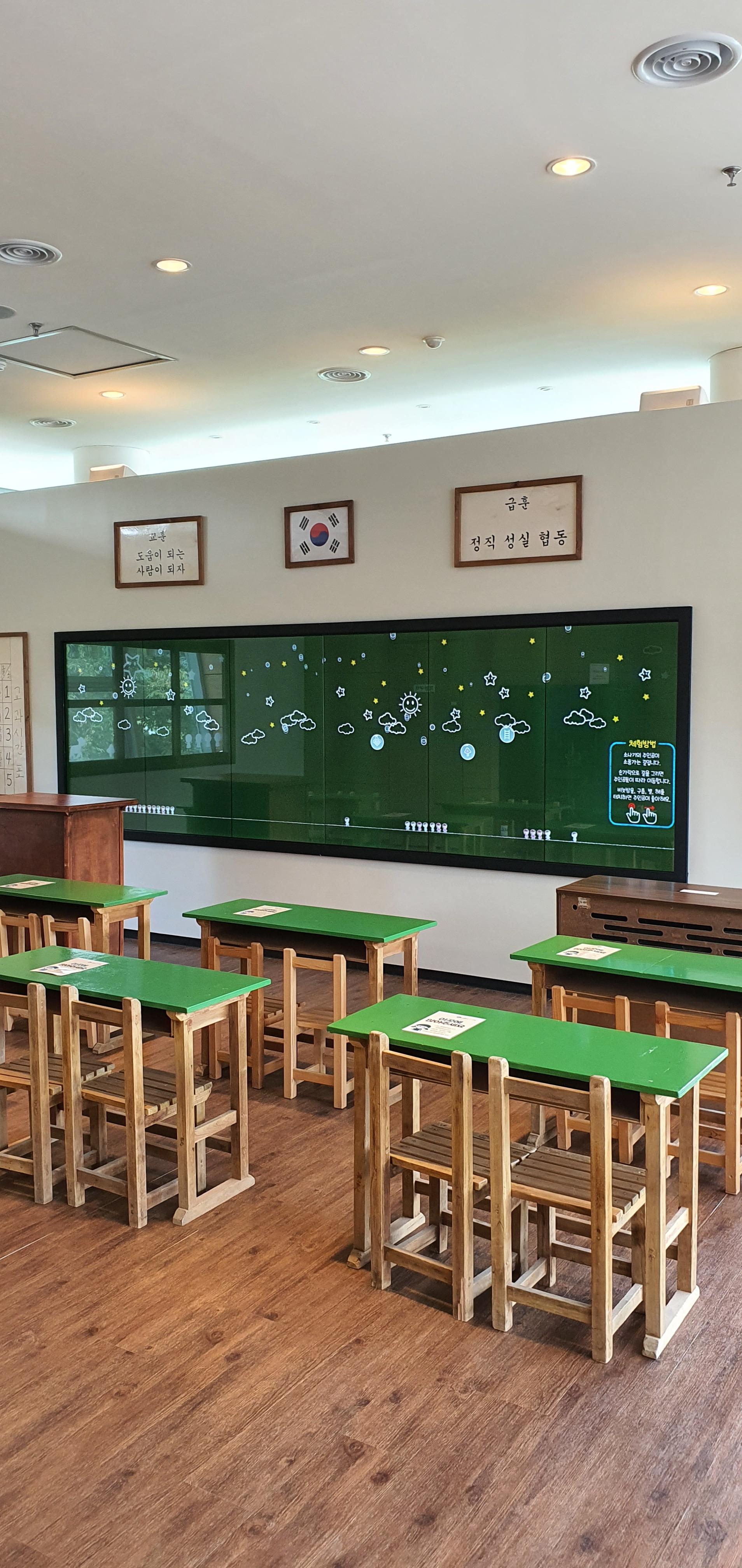 그리고 아래와 같이 교실처럼 꾸며 놓은 곳도 있었는데 이곳도 아이들이 무척 재밌어했다. 저 멀리 보이는 칠판이 사실은 디지털 TV 같은 것이고 손가락으로 길을 그리면 TV 안에 있는 아이들이 길을 따라서 올라오는 게임 같은 것도 할 수 있었는데 아이들이 엄청 좋아했다.