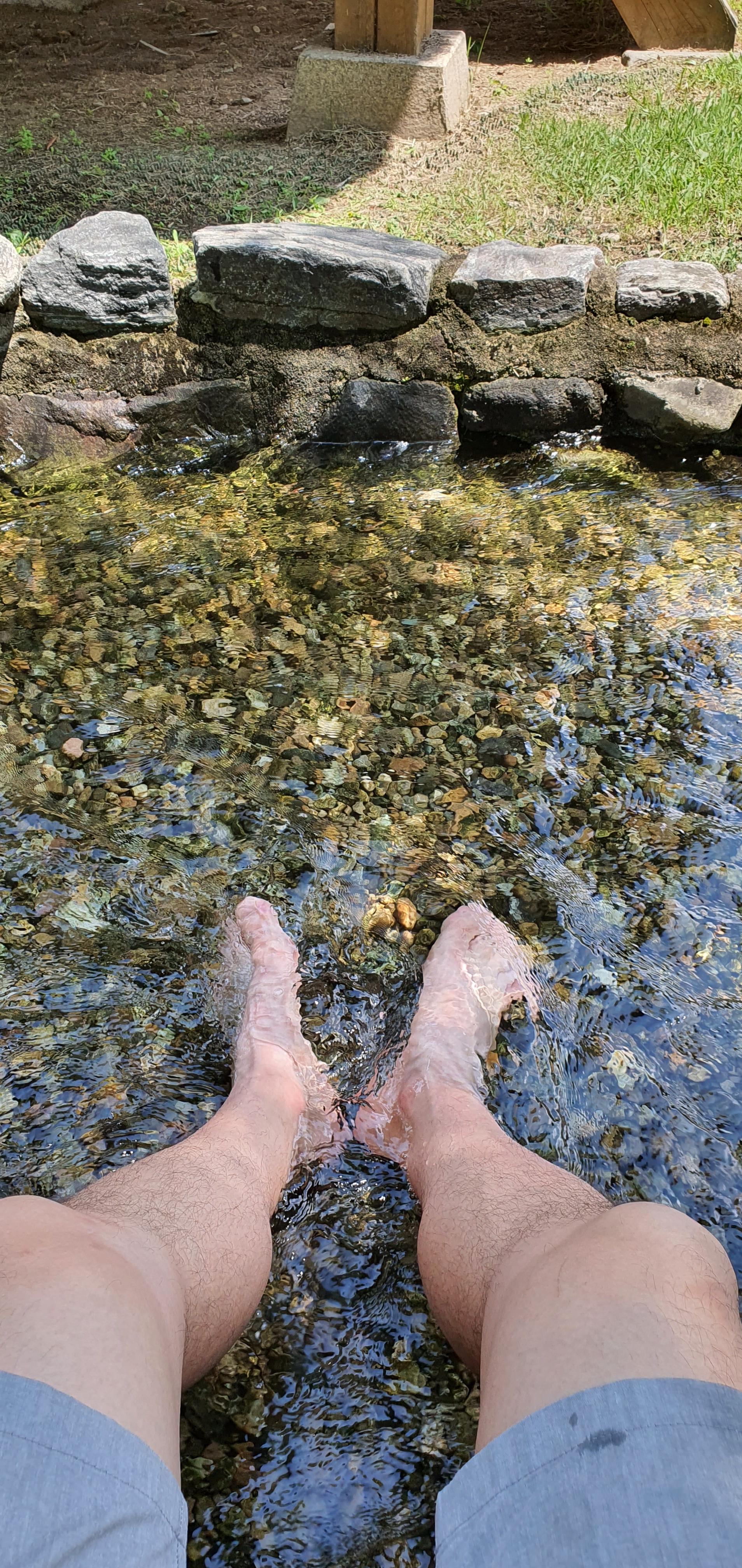 그리고 무엇보다 밖에서 제일 좋았던 건 잠깐 발을 담글 수 있을 정도의 얕은 깊이의 개울가였다. 나무 그늘 아래에서 이렇게 발을 담그고 있으니 더위가 한결 가시는 느낌이었다.